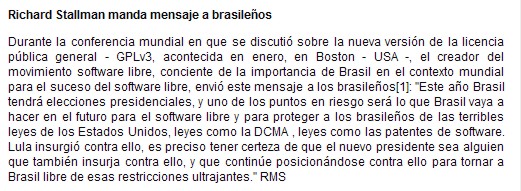 Em 2006 Stallman falou das eleições presidenciais do Brasil em Málaga. Está no blog do Marcelo Branco. Acesse aqui.
